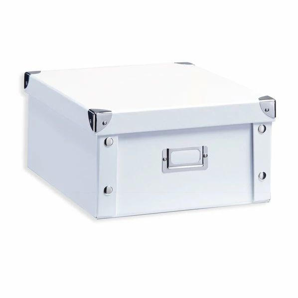 Weiße Aufbewahrungsbox aus Pappe mit Metallapplikationen. Egal in welchem Raum und für welche Utensilien – diese Box lässt sich vielseitig verwenden und kombinieren.