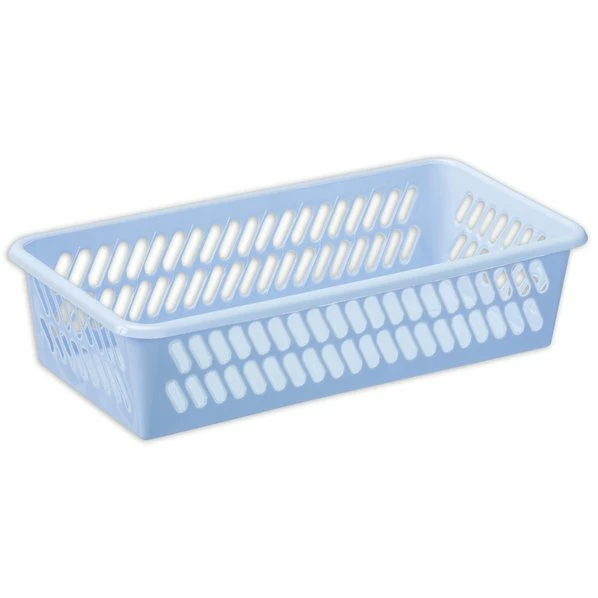 Mit dem blauen Haushaltskorb können Sie in Ihren Regalen oder Schränken für mehr Ordnung sorgen. Er wurde aus robustem Kunststoff gefertigt und bietet mit einer Breite von etwa 20 cm reichlich Platz für kleinere Utensilien.
