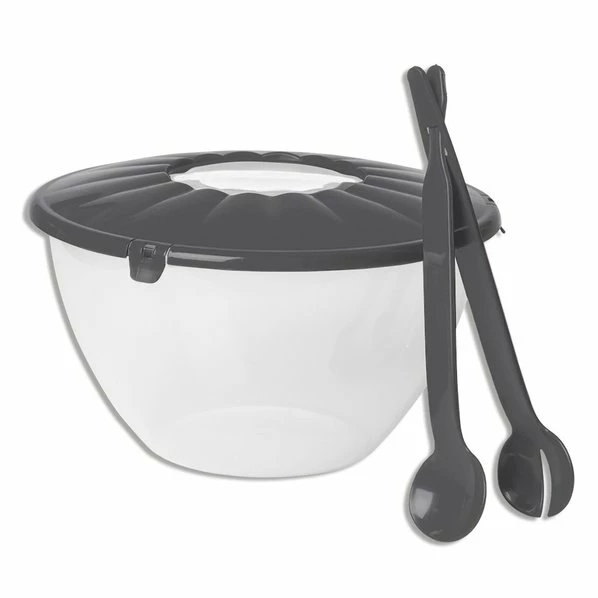Mit dieser grauen Salatschüssel aus Kunststoff haben Sie ein ideales Behältnis um leckere Salate anzurichten und zu transportieren. Neben dem verschließbaren Deckel erhalten Sie auch noch das passende Salatbesteck dazu und können Ihre Salatkreation direkt durchmischen und einfach aus den Schüssel entnehmen.