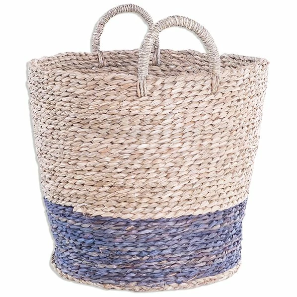 Der runde Seegraskorb ist in Blau und Braun gehalten und kann als Sammelbehälter oder Dekorationselement verwendet werden. Durch die Griffe lässt er sich einfach transportieren.