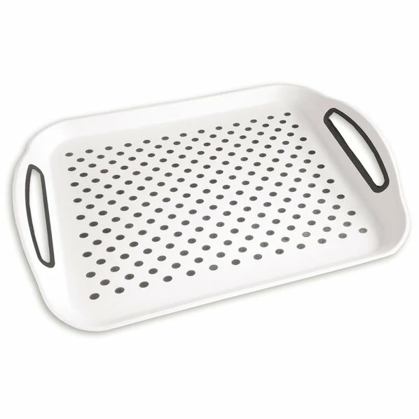 Für den sicheren Transport von Essen oder Getränke eignet sich dieses weiße Serviertablett geradezu perfekt! Es wurde aus Kunststoff gefertigt und die beiden Griffe vereinfachen die Handhabung.