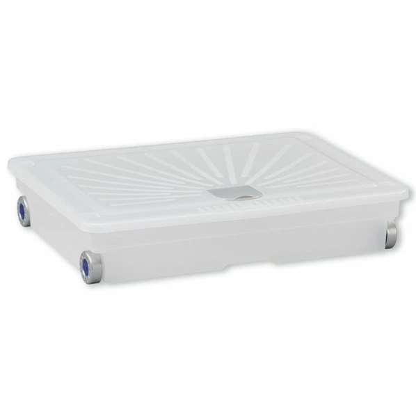 Diese transparente Unterbettbox mit einem Fassungsvermögen von 72 Litern eignet sich super zum Verstauen von Utensilien sämtlicher Art. Aufgrund Ihrer geringen Höhe und den 4 Rollen lässt sich die Box einfach unter das Bett schieben und nimmt somit keinen unnötigen Platz in Anspruch. Ein integriertes Duftfach im Deckel eignet sich super um die Box mit kleinen Duftkissen zu bestücken, so behalten eingelagerte Kleidungsstücke ein frisches Aroma und muffige Geruchsbildung wird verhindert. Außerdem ist die Box stapelbar und durch Ihre Transparenz von außen einsehbar, das erspart unnötiges suchen und schafft besseren Überblick.